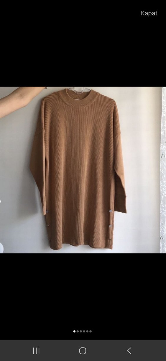 60 cm en. Bej renkli kadın kazak, uzun kollu ve yuvarlak yaka tasarıma sahiptir. Yumuşak triko kumaştan yapılmış, midi boyda ve yanlarda düğme detaylıdır. Rahat sokak stiline uygundur.
