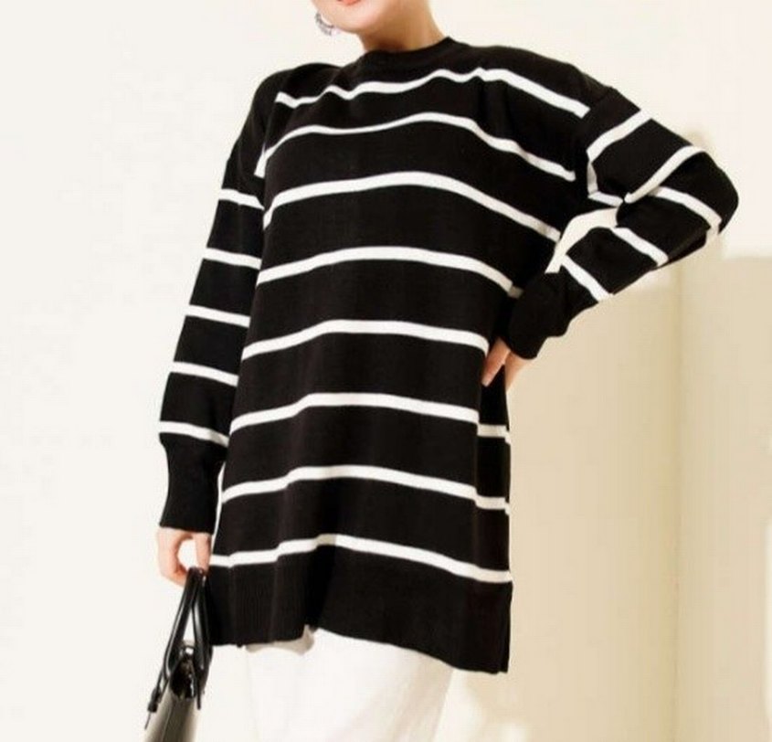 Siyah renkli, beyaz çizgili triko kazak, uzun kollu ve yuvarlak yaka detaylarına sahiptir. Standart beden sıfır hiç giyilmedi isteyene detaylı fotoğrafını atabilirim