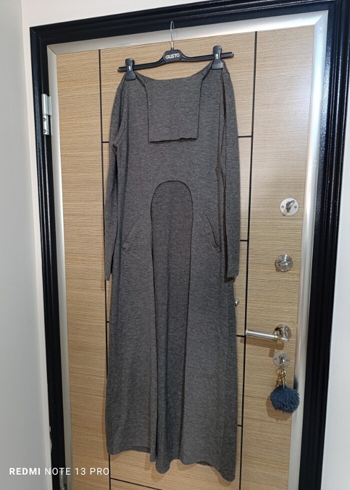 Uzun, önü kesim detaylı triko tunik. Hiçbir sorunu yok. Etiket bedeni L fakat kalıbı dar