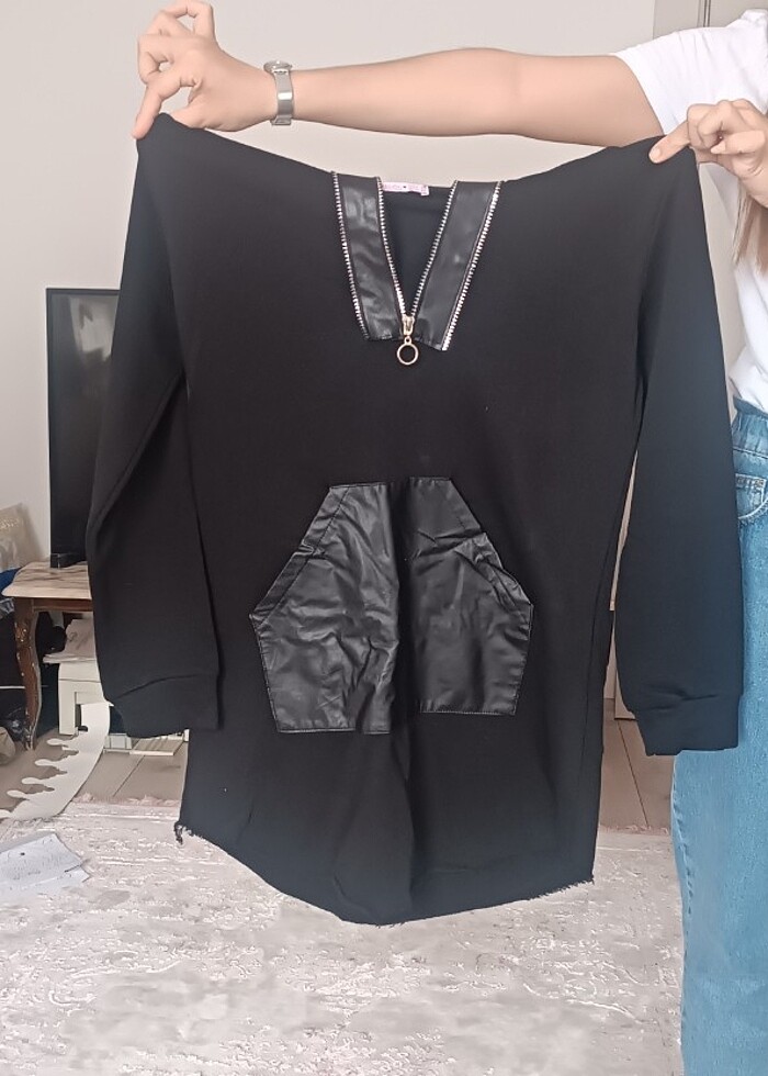 Siyah fermuarlı deri detaylı tunik/ triko. Etiketsiz ama sıfırdır. Kapüşonlu cepli, tarz