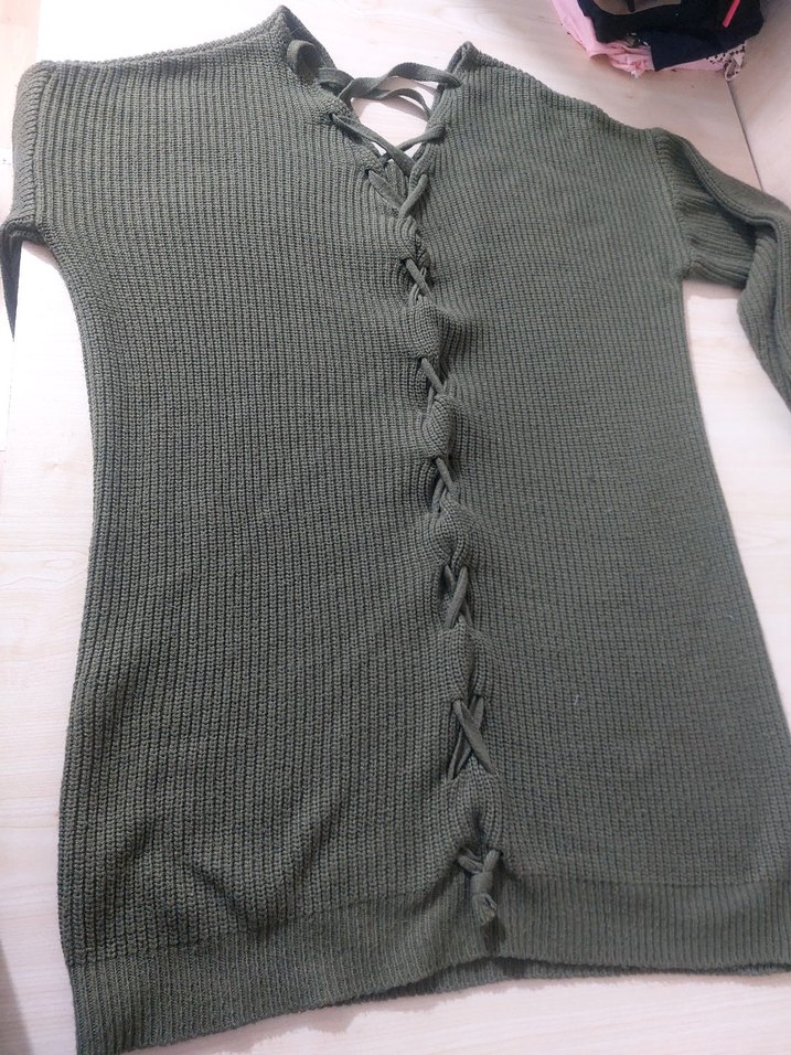 V yaka ve arkada bağcık detaylı, normal midi boyda, sade ve rahat tasarım. haki renk ... kullanılmış üründür