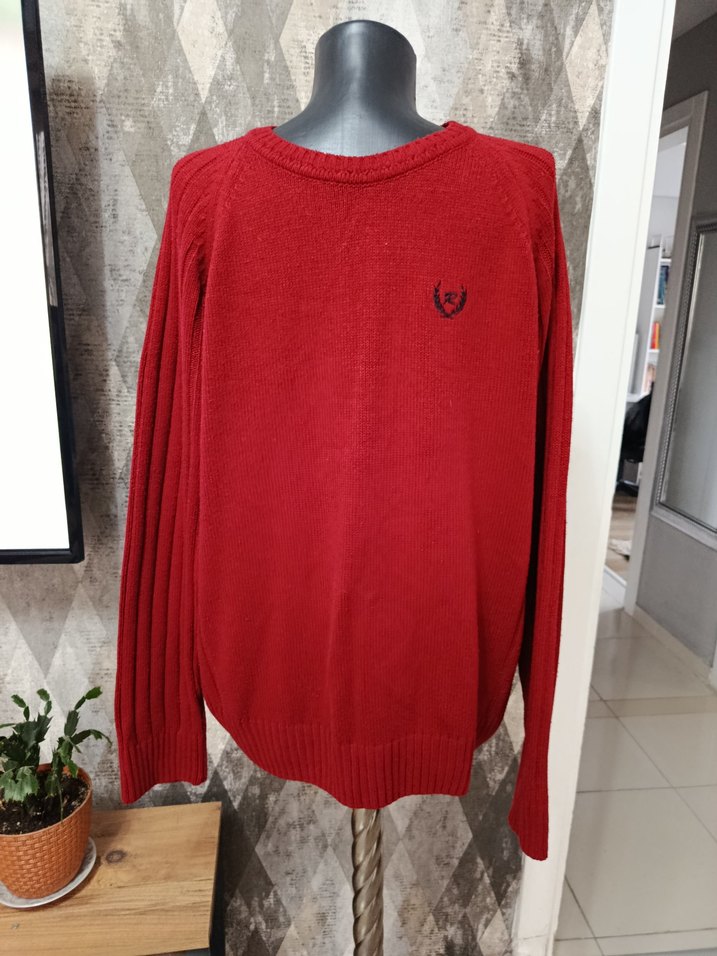 ölçüleri 57*67 cm. Bordo renkli, yuvarlak yakalı ve uzun kollu erkek triko kazak. biraz tülermesi vardır.