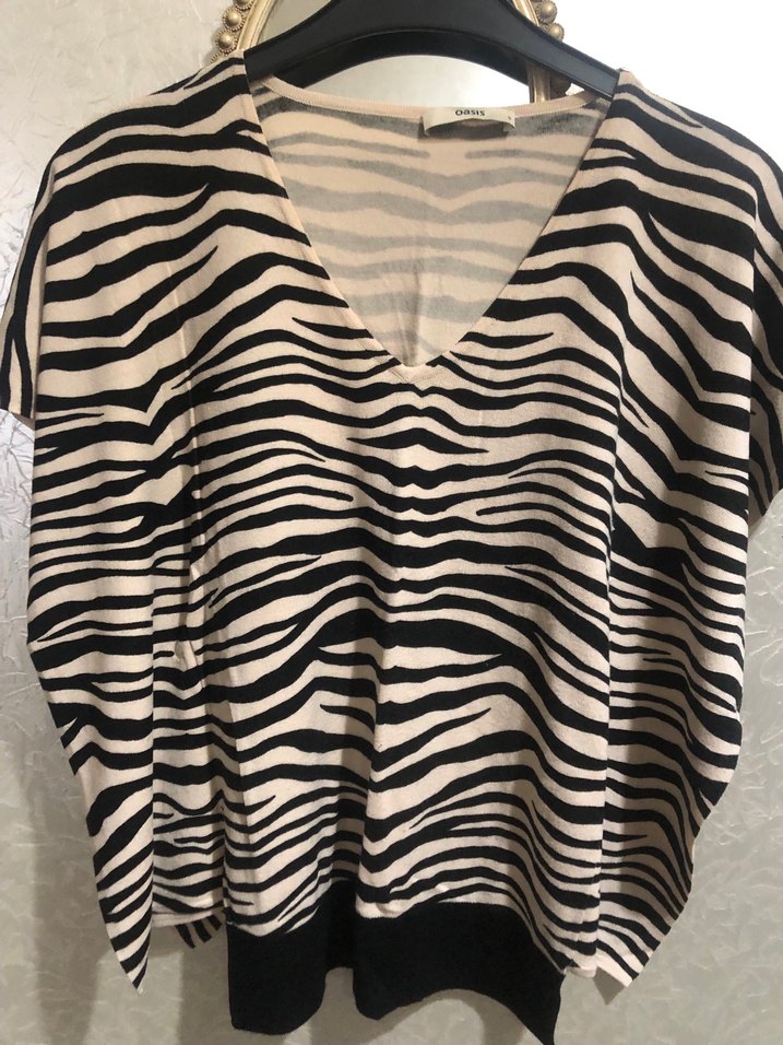 Uzun kollu, V yakalı, dökümlü tasarıma sahip, zebra desenli, sentetik kumaştan rahat kesim kadın bluz.trikodur iki yandan dikişli kollar döküm dökümdür çok temiz hiç bir deformasyon yok