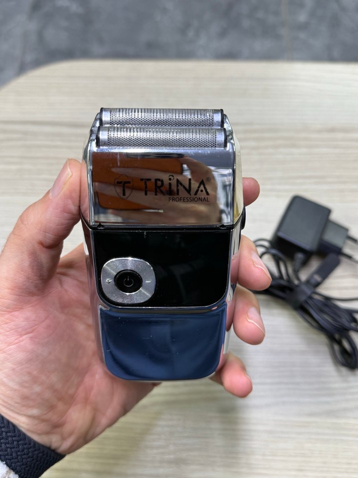 TRiNA profesyonel elektrikli tıraş makinesi, koyu mavi gövde, çift folyo başlık ve kullanımı kolay güç düğmesine sahiptir. Şarj cihazı dahildir.