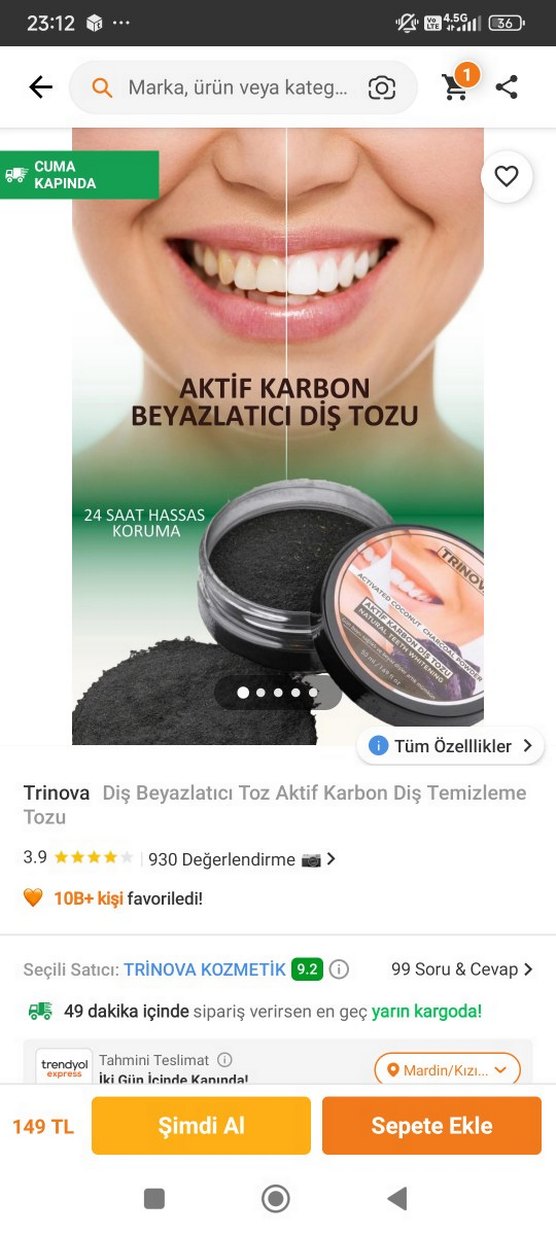 Trinova aktif karbon diş beyazlatıcı tozu, 24 saat hassas koruma ve etkili diş temizliği sağlar. Siyah toz formundadır.
