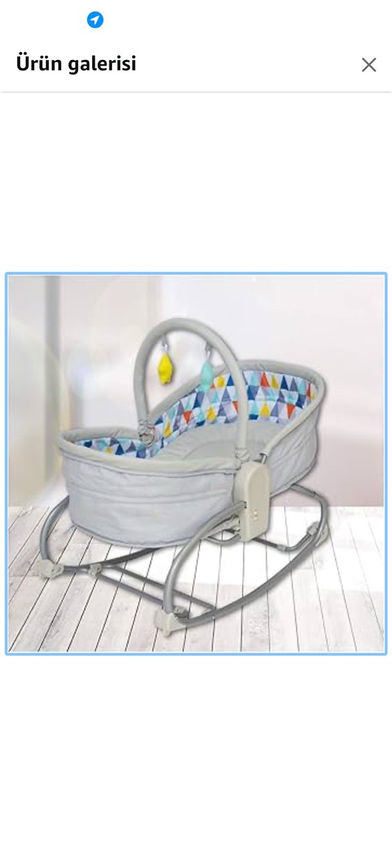Renkli üçgen desenli iç yüzeyi ve sallanan metal iskeleti olan gri, yumuşak dolgulu bebek sepeti. Oyuncak barı ve sallanma özelliği bulunur.
