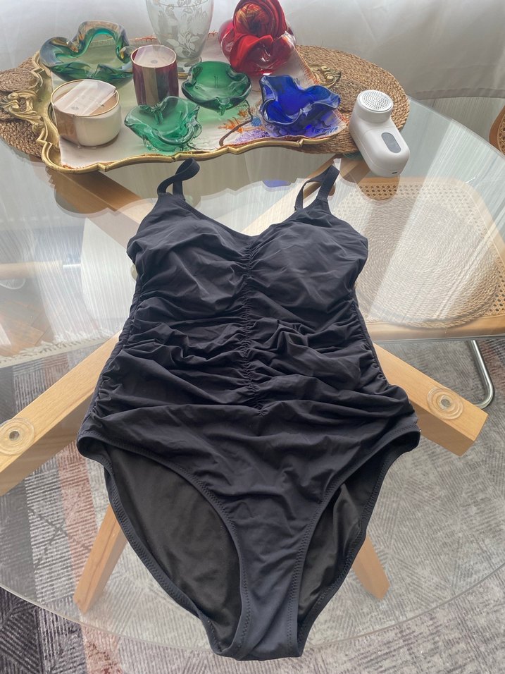 Siyah renkte, ince askılı ve drapeli detaylı, vücuda oturan midi uzunlukta kadın mayosu. Cesur ve gotik tarzda plaj kullanımı için uygundur.