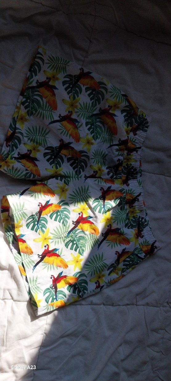 Canlı tropikal desenli, papağan figürlü bayan şort. %100 polyester kumaştan üretilmiştir, hafif ve rahattır. Beli lastiklidir, günlük kullanım ve yaz ayları için uygundur. İkinci eldir, temiz ve iyi durumdadır. Fotoğraflarda görüldüğü gibidir.