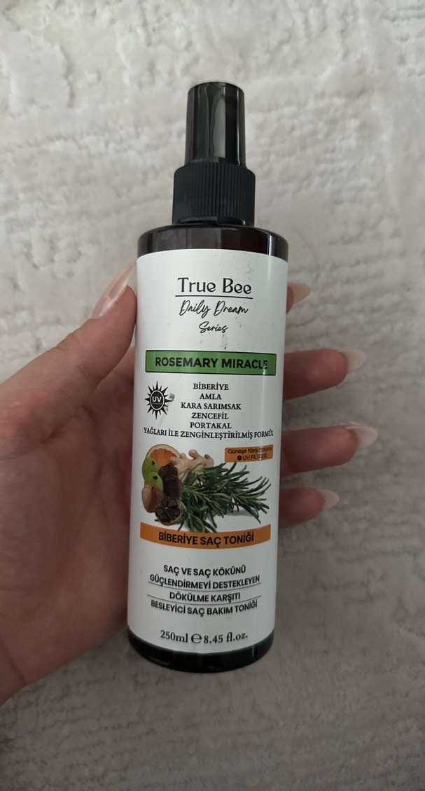 Ürün sıfırdır True Bee Biberiye Saç Toniği, biberiye, amla, kara sarımsak, zencefil ve portakal gibi doğal içeriklerle saç ve saç kökünü güçlendirir, dökülmeye karşı destek sağlar.
