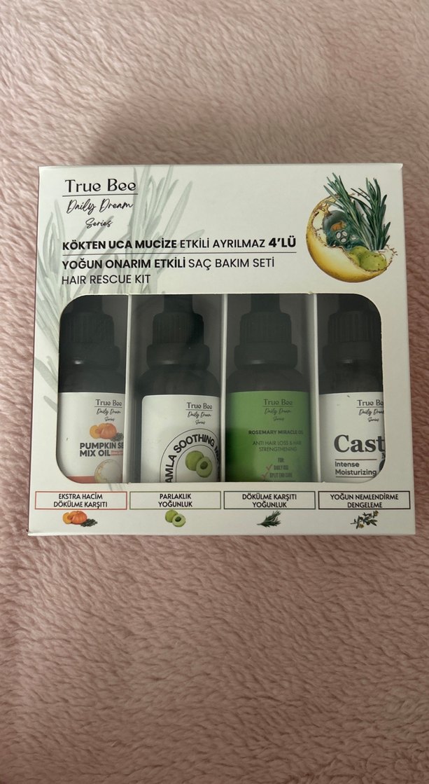 True Bee saç kurtarma seti, yoğun onarım, parlaklık, dökülme karşıtı ve nem dengesi sağlayan dört üründen oluşur. Bu ürünü hiç kullandım. Gratisten satın almıştım. Hiç kullanılmamıştır, şişeler açılmadı bile yani. Kullanmadığım için satmak istiyorum.
