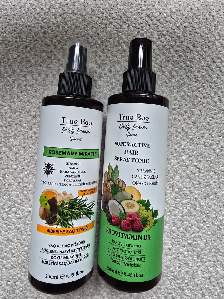 True Bee Rosemary Miracle ve Superactive saç sprey tonik, amla, kara sarımsak ve provitamin B5 ile saç kökünü güçlendirir, saç dökülmesini azaltır ve saçları onarır. Ürünler orjinaldir. 3. görselde mavi stickerla işaretli yere kadar kullanılmıştır.