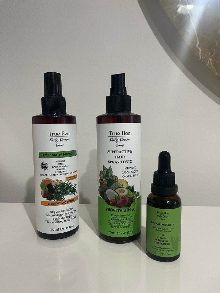 True Boo saç bakım seti; biberiye nane sprey, provitamin B5 içeren süperaktif saç toniği ve besleyici saç yağı içerir. Saç ve saç derisini destekler.