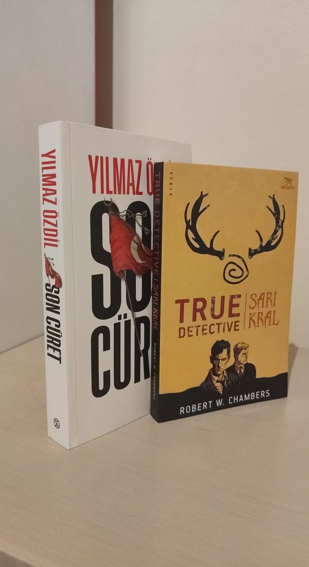 Robert W. Chambers'ın True Detective ve Yılmaz Özdil'in Son Cüret romanları, dikkat çekici kapakları ve sürükleyici hikayeleriyle yer alıyor.