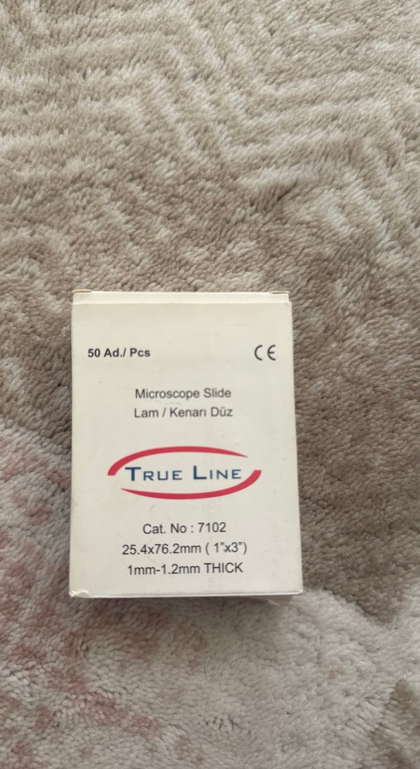 True Line mikroskop lamları, 25.4x76.2mm boyutunda ve 1-1.2mm kalınlığında. Kutuda 50 adet, kenarı düz. CE sertifikalı.