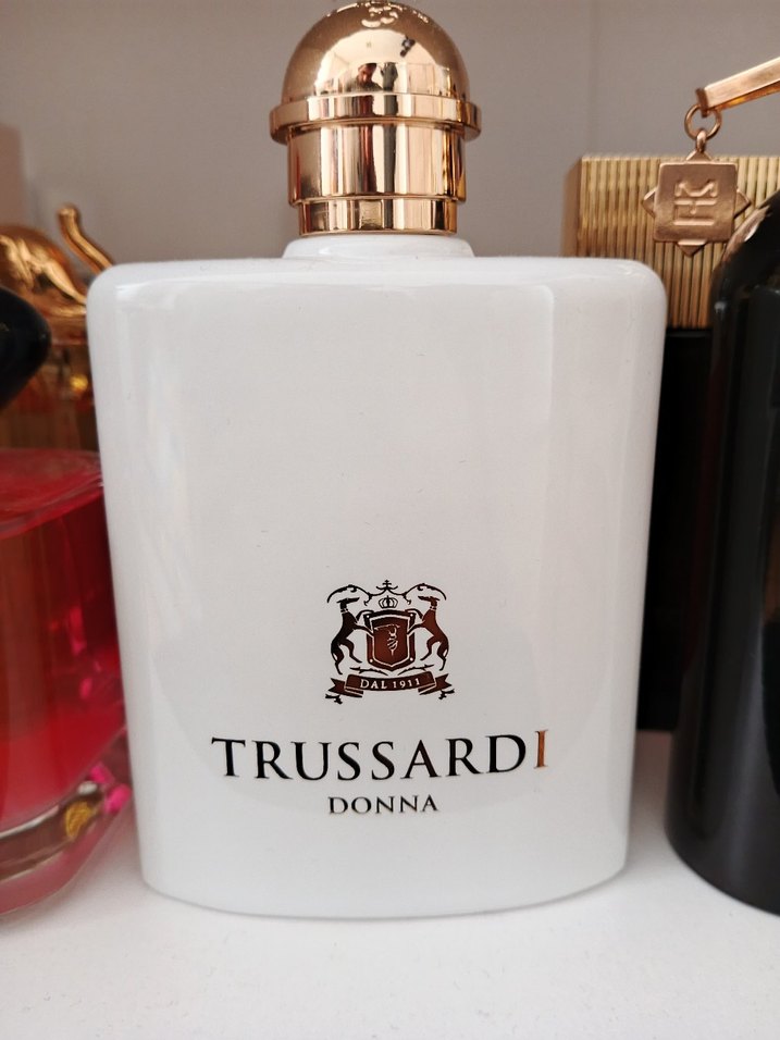 Trussardi Donna, şık beyaz şişesi ve altın kapaklı tasarımıyla zarif bir kadın parfümüdür.