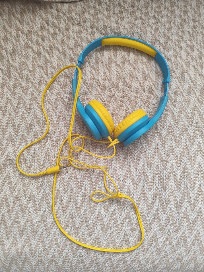 Sarı kulak pedleri ve başlık yastığına sahip, mavi çerçeveli renkli kablolu kulaklık. Günlük kullanım için rahat . az kullanılmış