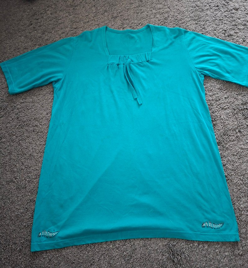 Turkuaz renkli, coton tshirt, sorunsuzdur, tüm boy 77cm,koltuk altından koltuk altına 57cm,beden yazmıyor, ölçüyü esas alın XXL uyumlu