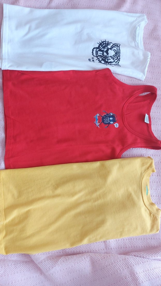 Kırmızı, beyaz ve sarı renklerde baskılı çocuk atletleri. Yumuşak ve rahat kumaştan üretilmiştir. 2 adet kisa kollu tshirt 1 adet atlet tshirt. marka ve bedenleri resimde vardir.