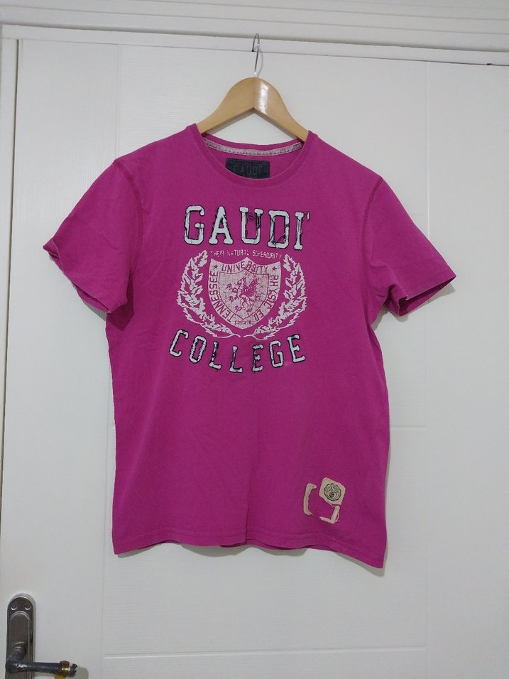 kısa kollu, yuvarlak yaka, pamuklu tişört. Renkli baskılı "GAUDI COLLEGE" yazısı ile sokak tarzına uygun.