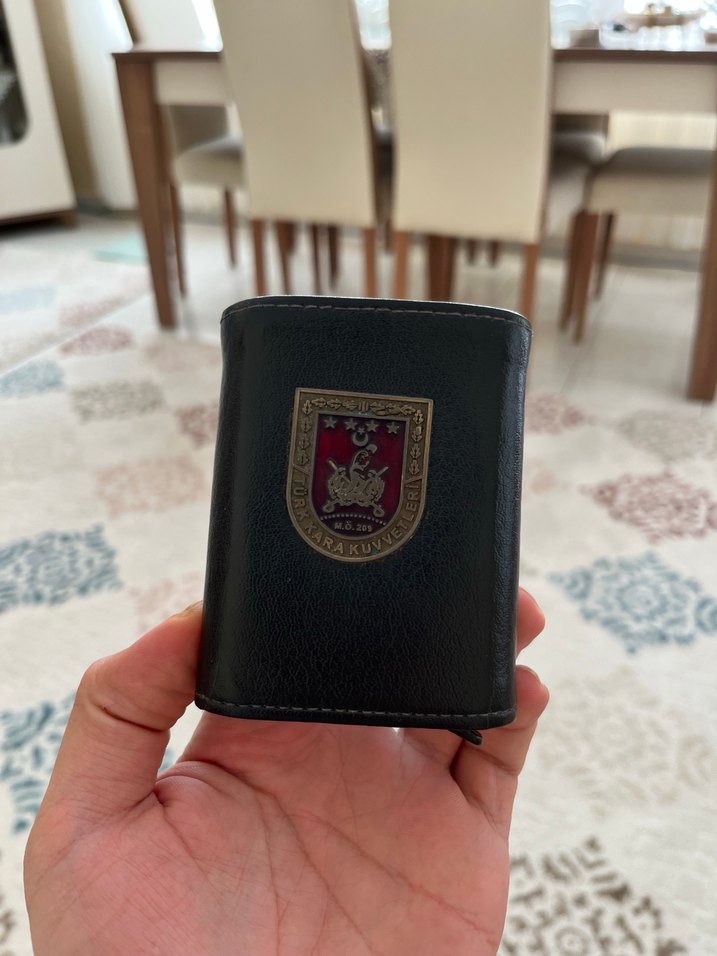 Bu erkek cüzdanı, bordo renginde ve önünde baskılı bir amblemle sade ve karşı kültür Paris tarzını birleştirir kart mekanizması vardır