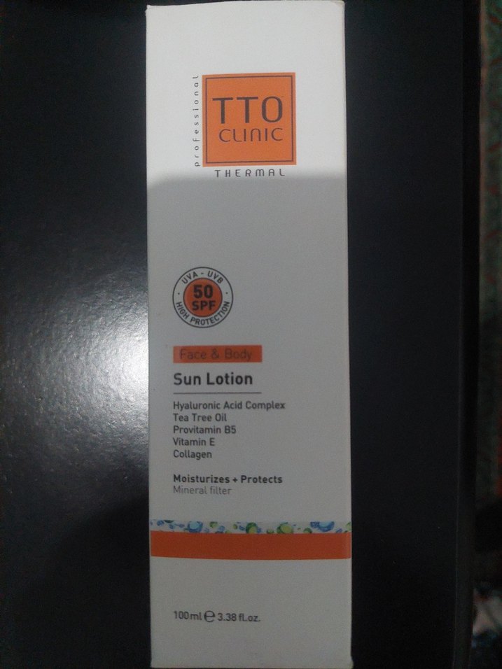 TTO Clinic güneş losyonu, SPF 50 koruma sağlar ve hyaluronik asit, çay ağacı yağı, provitamin B5, vitamin E ile kolajen içerir. Cildi nemlendirir ve korur. ☀️1 kere kullanıldı.cildime iyi gelmediği için satıyorum.