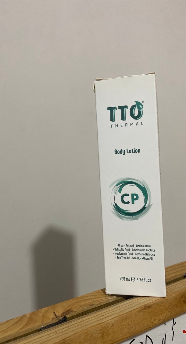 TTO Thermal CP Vücut Losyonu, çay ağacı ve deniz yıldızı yağı gibi doğal yağlar ve asitler içerir, cildi yatıştırır ve besler.
