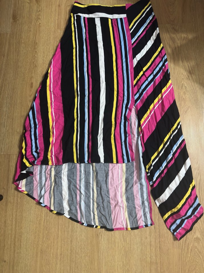 çizgili asimetrik kesim midi boy yırtmaçlı etek