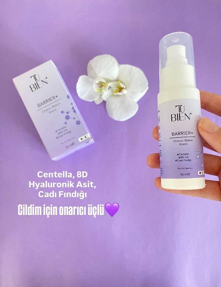 TU BİEN BARRIER+ ONARICI BAKIM KREMİ Cildin doğal bariyerini onarmaya yardımcı olan hyaluronik asit içeriği ile cildinizin nem dengesini korur.Centella Asiatica ve Chamomilla Recutita (papatya özü) gibi bitkisel özlerle zenginleştirilmiş formülü sayesinde cildinize nazikçe bakım yapar ve cilt bariyerinin güçlenmesine destek olur.Su bazlı formülü ile akneye eğilimli ciltlerde bile etkin sonuçlar gösterir. Zararlı kimyasallardan arındırılmış yapısıyla hassas ciltler dahil tüm cilt tiplerine uygundur. 50 ml boyutuyla pratik kullanım sunar; günlük rutininizin vazgeçilmezi olacak kadar idealdir. Krem kıvamındaki dokusu kolayca emilir ve cildinizde ağırlık hissi bırakmaz. Hamamelis Virginiana (cadı fındığı) özü ile ferahlatıcı etki sağlayarak cildinizin tazelik kazanmasına katkıda bulunur. FAYDALARI Cildi onarır ve yeniler. Cilt bariyerini güçlendirir.Cildi derinlemesine nemlendirir, pürüzsüzleştirir, su kaybını önler ve esneklik kazandırır.Gözenekleri sıkılaştırır. Cildi yatıştırır