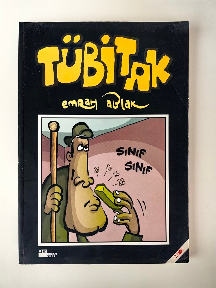 Emrah Ablak'ın TÜBİTAK adlı mizah kitabı, çubuk ve silgi tutan karakterin yer aldığı karikatür kapakla sınıf temalı espriler sunar.