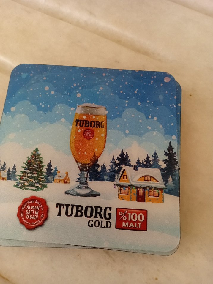 Parlak altın renkli, Tuborg Gold ve %100 Malt logosu bulunan, kış temalı bardak altlığı.6 adet fiyatı