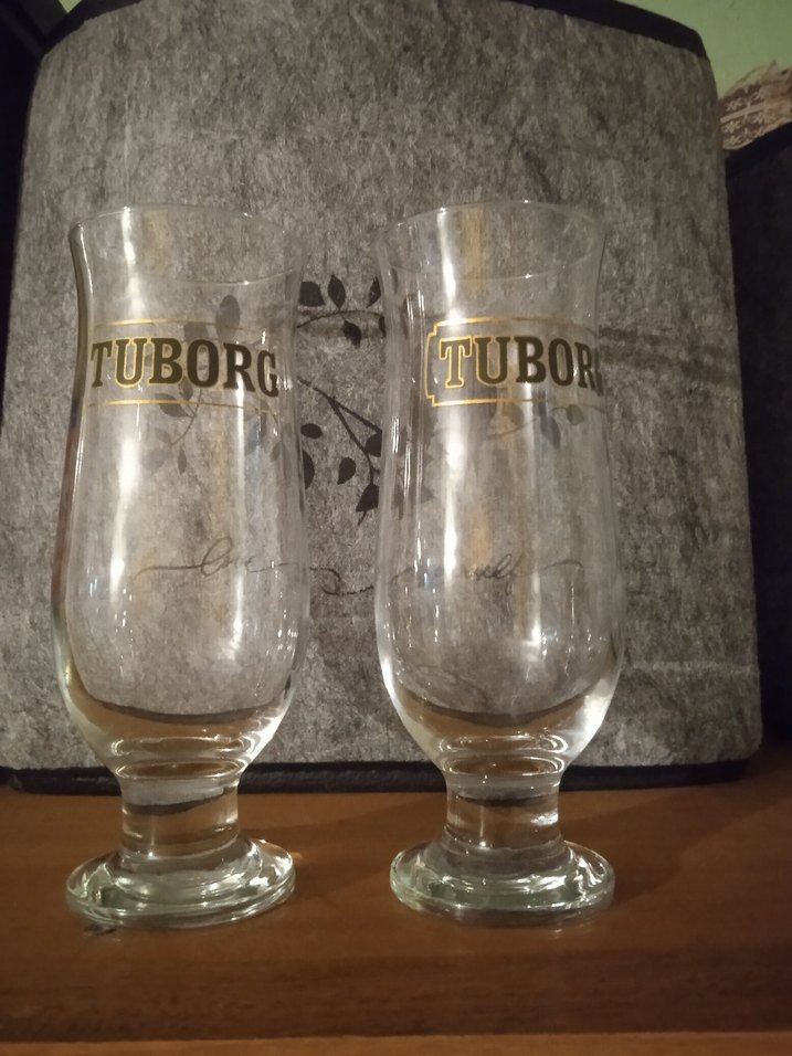 Altı sağlam ve uzun yapıda, üzerinde altın renk Tuborg logosu bulunan iki adet şeffaf bira bardağı. kullanılmadı kutu içi de çoğu kırılmış kalanları yükledim meraklısına