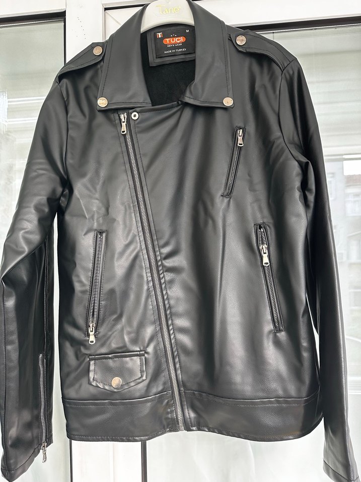 TUC markalı siyah deri biker ceket, çıtçıtlı yakalı, çoklu fermuarlı ceplere sahip. Parlak yüzeyli, normal kesim boy 75 en 50 cm hediye aldım küçük geldi kullanılamadı