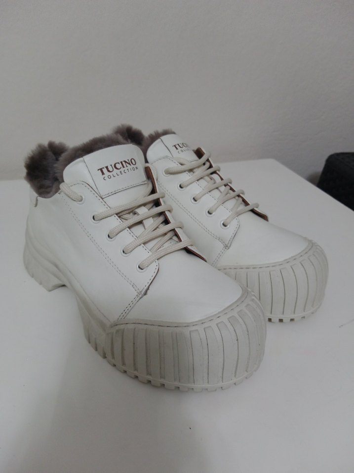 Tucino markalı beyaz spor ayakkabılar, platform topuk ve kürk detayına sahiptir. Hiç kullanılmadı.