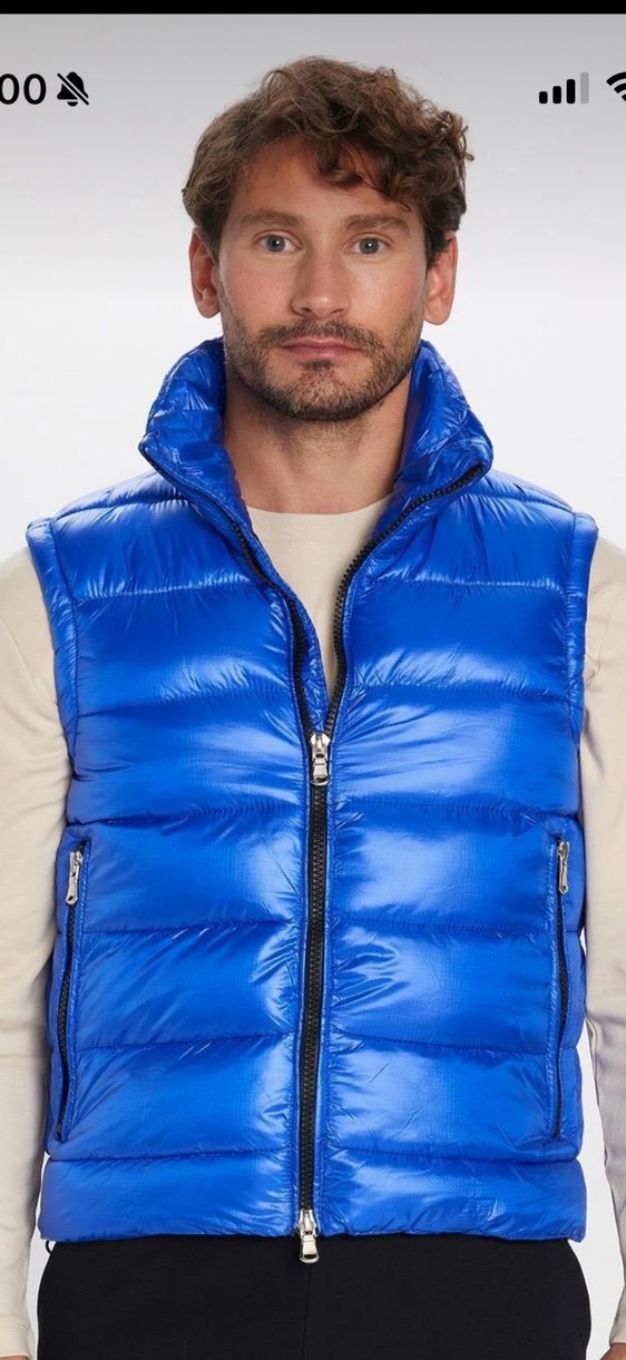 Parlak mavi renkte, fermuarlı ve dar kesim erkek şişme yelek. Sentetik kumaştan, gündelik sokak tarzı için uygun.