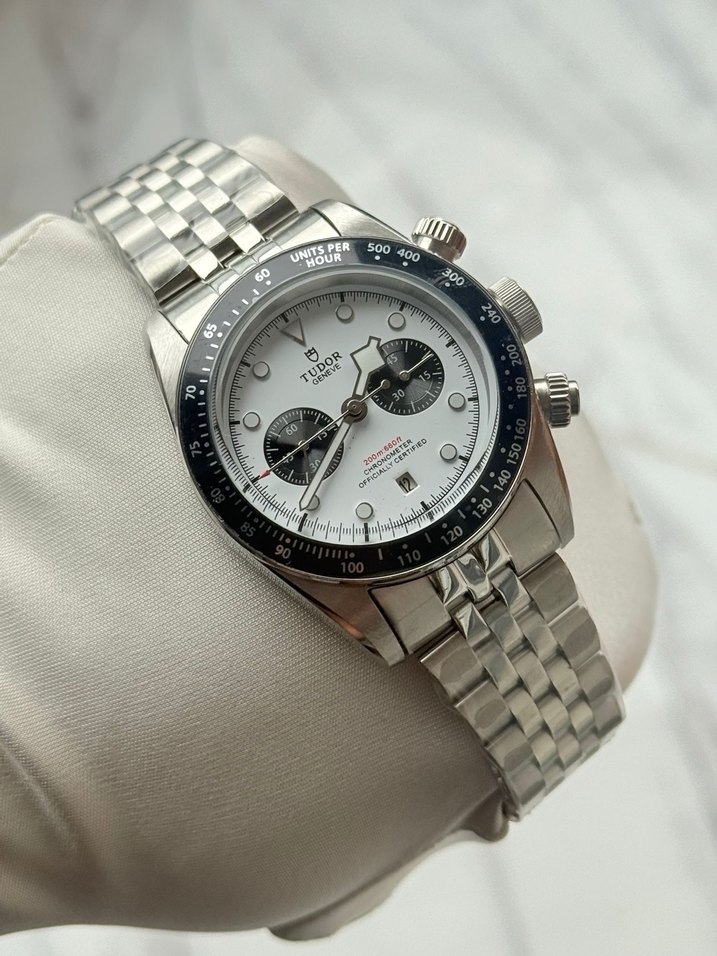 Tudor erkek saati, beyaz kadran ve gri alt kadranlara sahip, paslanmaz çelik bilezik ile modern klasik tasarımı bir araya getiriyor. Kronograf fonksiyonları mevcut. ⌚