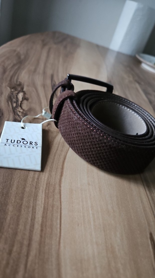 Tudors markalı koyu kahverengi, dokulu yüzeyli erkek kemeri, minimalist ve çağdaş tarzda, trend günlük kullanım için uygun.