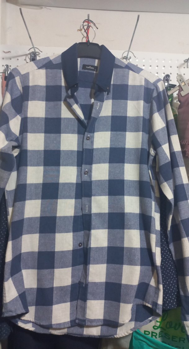 Erkek gömlek, düğmeli ön, yakalı ve uzun kolludur. Pamuk kumaştan yapılmış, mavi kareli deseni ve rahat kesimiyle günlük sokak stiline uygundur.