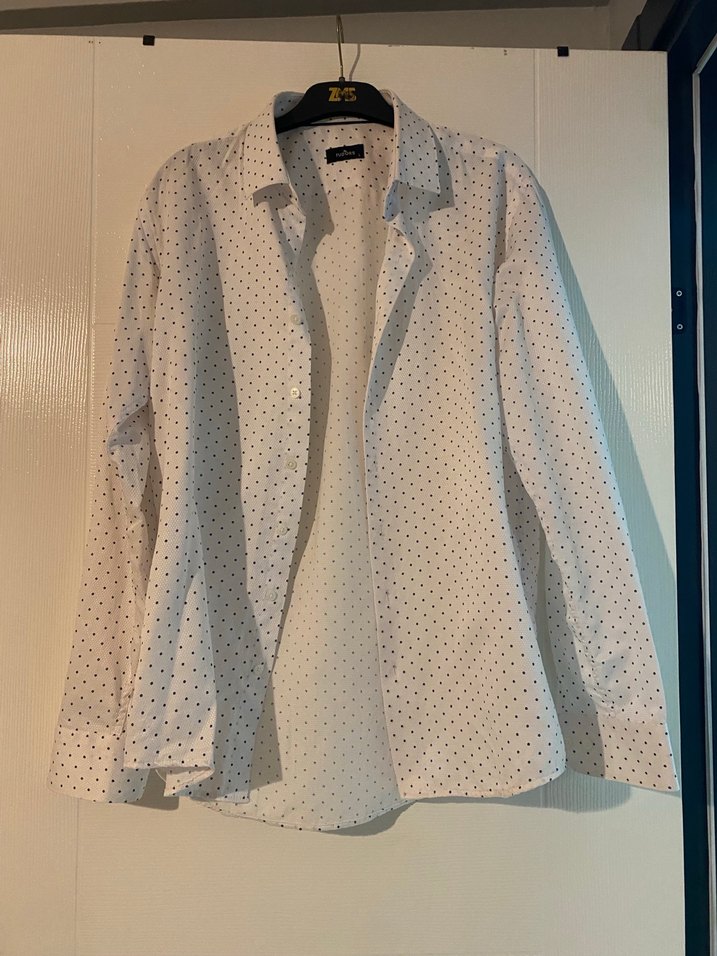 Erkekler için uzun kollu, düğmeli, pamuklu gömlek. Normal uzunlukta ve regular fit olan bu beyaz gömlek, gri noktalı desenlidir ve ofis ile günlük kullanıma uygundur.