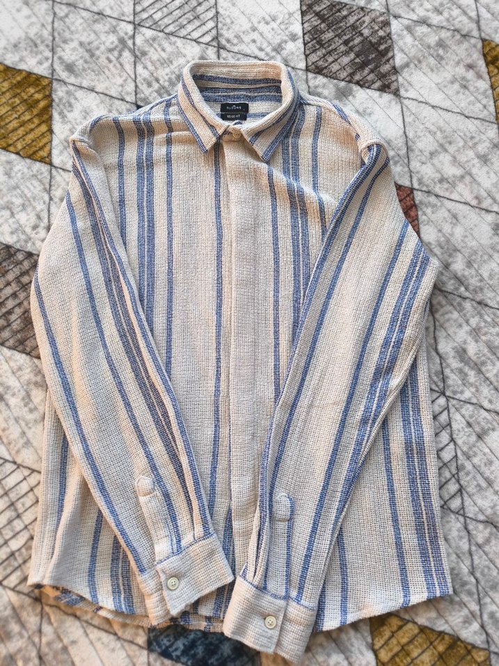 Marka Temsilidir! Bej keten erkek gömlek, mavi çizgili, uzun kollu ve yakalı. Düğmeli manşetli, rahat kesim, günlük kullanım için uygun. Bel 50cm, Boy 75cm.