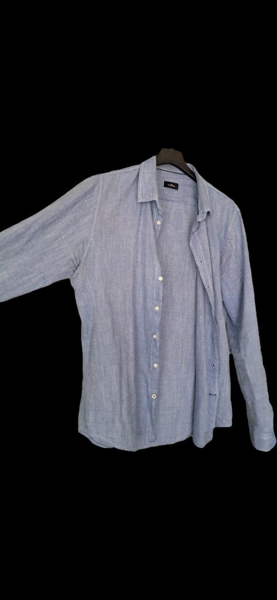 Uzun kollu, kesik yakalı mavi keten erkek gömleği. Düğmeli ve regular fit, günlük rahat sokak stiline uygun. Desensiz ve midi boyda.