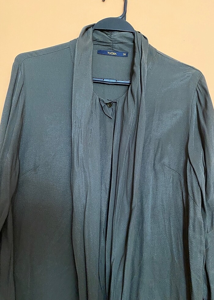 tuğba gömlek bluz haki, boyundan bağlamalı fularlı