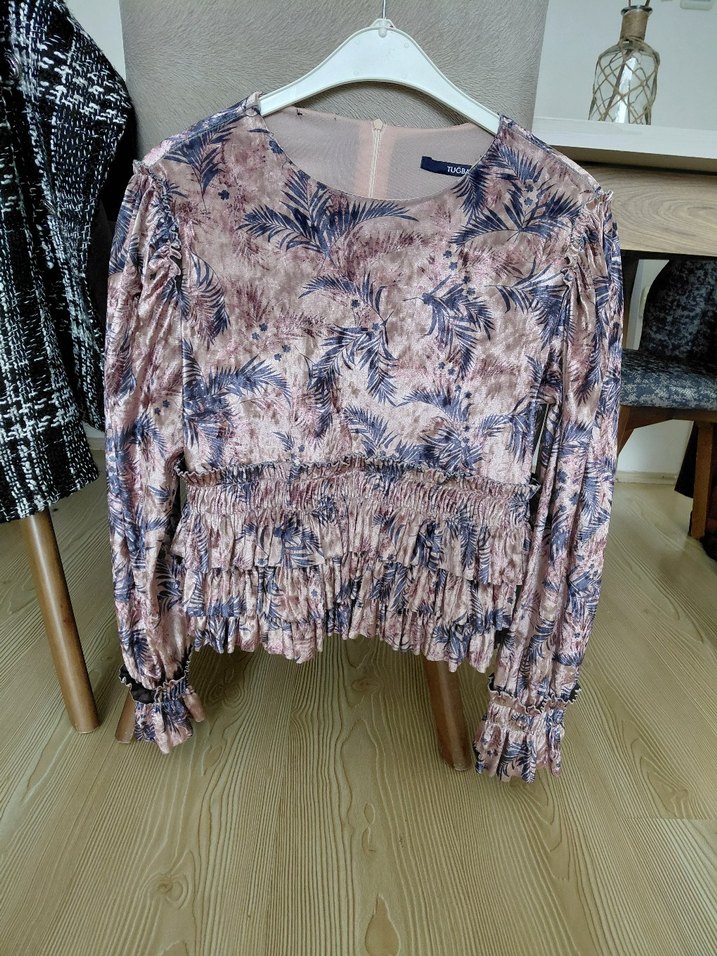 Pembe pastel tonlarda, uzun kollu, yuvarlak yakalı ve bol kesim, fırfır detaylı kısa boy , etek üstü bluz. Tuğba marka , 2-3 kez giydim. 2 numara yani 38-40 beden ama ben 36 beden olarak sorunsuz giydim geniş istedim. Sadece en son fotoda gözüktüğü gibi astar kısmında ufacık bir delik olmuş, etiketi koparırken oldu ama asla gözükmez, kullanıma engel değil
