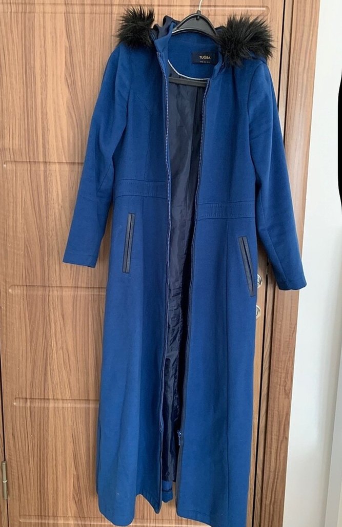 1,2 kez giyildi Kadın mavi uzun kaban, kapüşonunda kürk detaylıdır. Yumuşak ve sıcak kumaştan, uzun kollu ve fermuarlı ceplidir. Günlük kullanıma uygundur. 1 kez giyildi