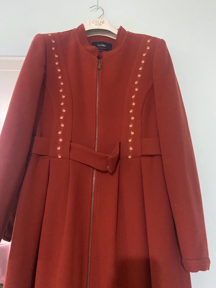Bu uzun bordo kaban, fermuarlı ön ve nakış detaylarına sahip, vücuda oturan kesimdedir. Yumuşak ve sıcak kumaştan yapılmış olup, modern klasik tarzda ve ofis kullanımı için uygundur. Uzun kollu ve kesimli yaka detaylıdır. ❄️ az kullanılmıştır