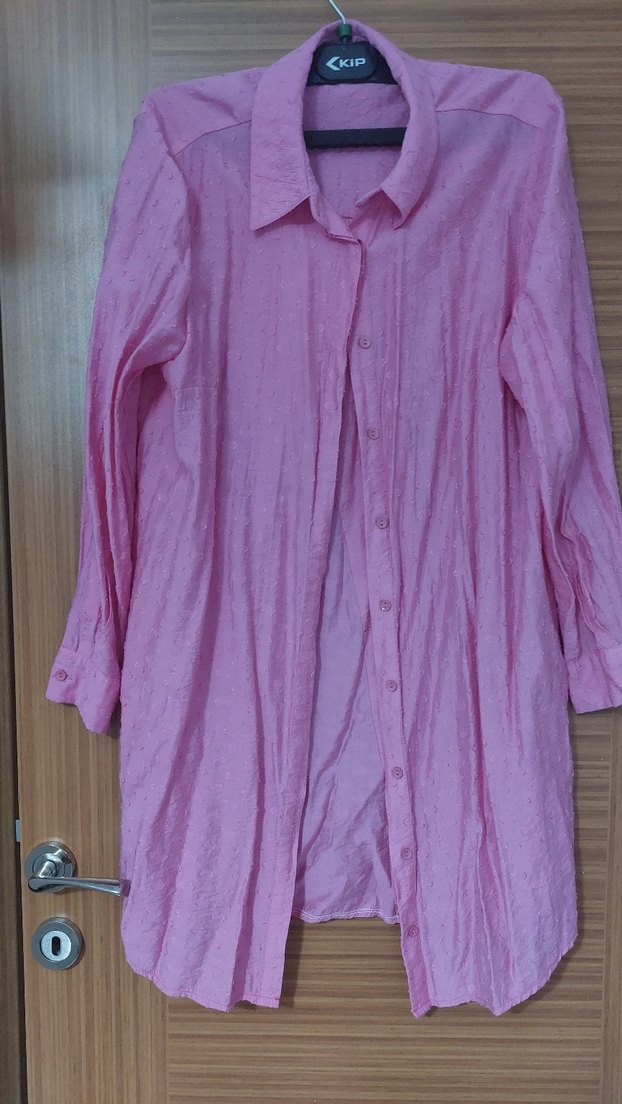 Pastel pembe keten gömlek, uzun kollu, düğmeli ve bol kesimdir. Minimalist ve bohem tarzıyla günlük kullanıma uygundur.