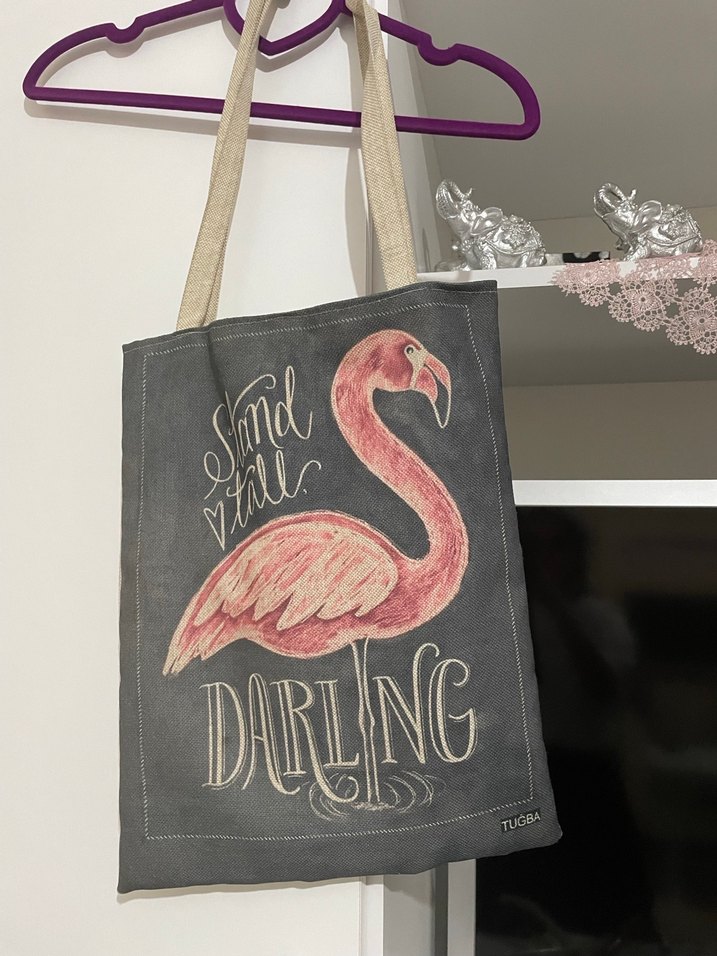 Püsküllü detaylara sahip gri tekstil çanta, pembe flamingo baskılıdır ve romantik gece için bohem vintage tarz sunar.