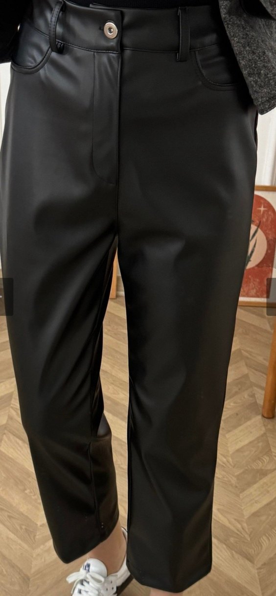 Siyah deri kumaştan, kemerli ve normal boy midi kesim kadın pantolon. Ofis için uygun, desen içermeyen şık bir tasarım. 40 bedene daraltildı ,sayılı giyildi