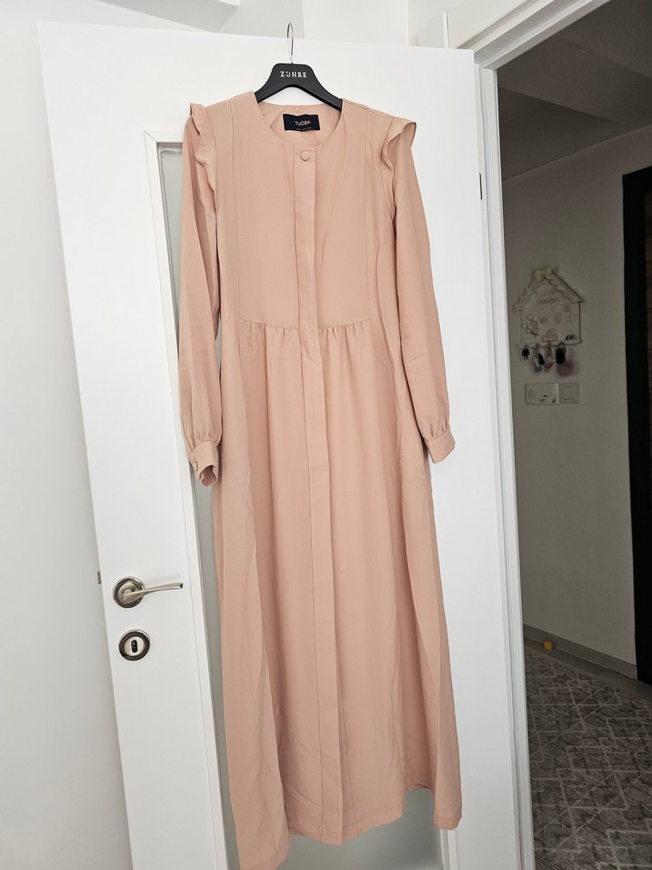Bej renkli, uzun kollu, salaş kesim kadın elbisesi. İnce ve ipeksi kumaştan, drapeli tasarıma sahip, minimalist normcore stilinde, günlük kullanıma uygun. Bir defa giyildi, önünde ufak bir leke var resmini paylaştım. Yıkamadım. 38 beden Tuğba marka. Resimde pudra renk gibi çıkmış ama baya vizon. Önü tamamen düğmeli ferace gibi de kullanılır.