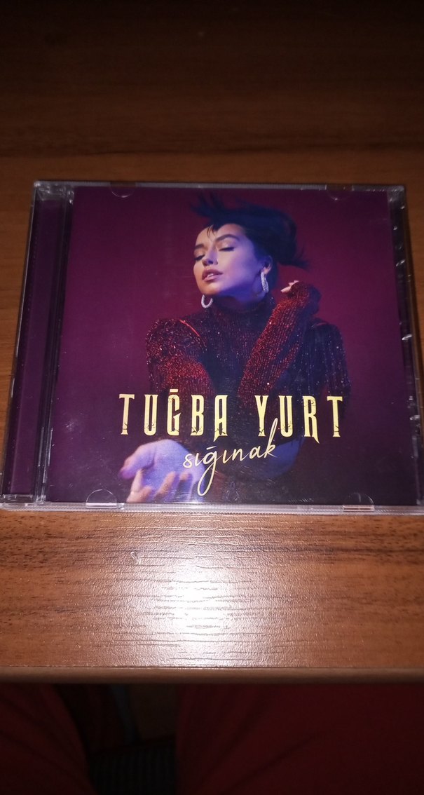 Tuğba Yurt'un "Sığınak" adlı CD albümü, mor arka plan önünde koyu kırmızı kıyafetli sanatçıyı gösterir.