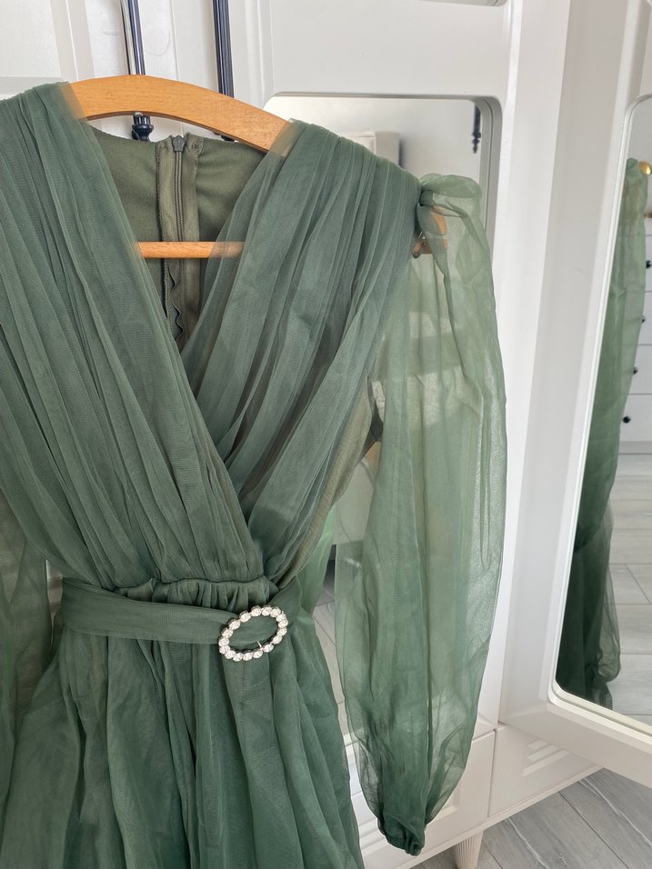 Haki bohem uzun elbise, V yaka ve askılı kollu. Yumuşak şifon kumaştan, bol kesim ve inci detaylı kemerli. Düğünler için uygun.